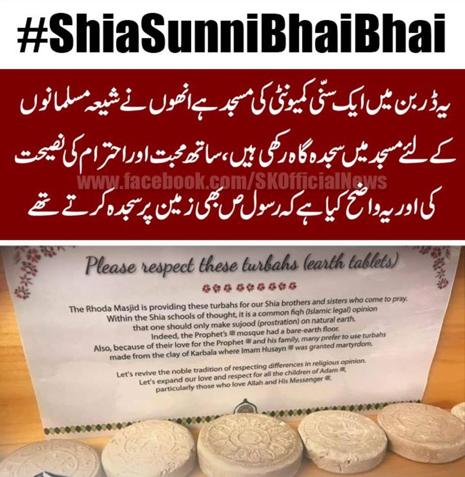 یہ ڈربن میں سنّی کمیونٹی کی مسجد ہے انھوں نے شیعہ مسلمانوں کےلئے مسجد میں سجدہ گاہ رکھی ہیں، ساتھ محبت اور احترام کی نصیحت کی اور یہ واضح کیا ہے کہ رسول اکرم ص بھی زمین پر سجدہ کرتے تھے