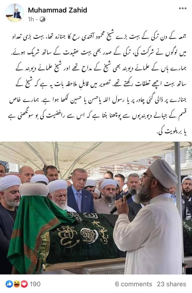 جمعہ کے دن ترکی کے بہت بڑے شیخ محمود آفندی رح کا جنازہ تھا، بہت بڑی تعداد میں لوگوں نے شرکت کی، ترکی کے صدر بھی بہت عقیدت کے ساتھ شریک ہوئے. ہمارے ہاں کے علمائے دیوبند بھی شیخ کے مداح تھے اور شیخ علمائے دیوبند کے ساتھ بہت اچھے تعلقات رکھتے تھے. تصویر میں قابلِ ملاحظہ بات یہ ہے کہ شیخ کے جنازے پر ڈالی گئی چادر پر یا رسول اللہ یاحسن یا حسین لکھا ہوا ہے ۔ ساتھ علیہ السلام کا “ع” بھی ہے – ویسے بظاہر دوسری طرف اوپر یا اللہ اور نیچے یا علی یا فاطمہ ہوگا۔. ہمارے خاص قسم کے جیالے دیوبندیوں سے پوچھنا بنتا ہے کہ اس سے رافضیت کی بو سونگھنی ہے یا بریلویت کی.