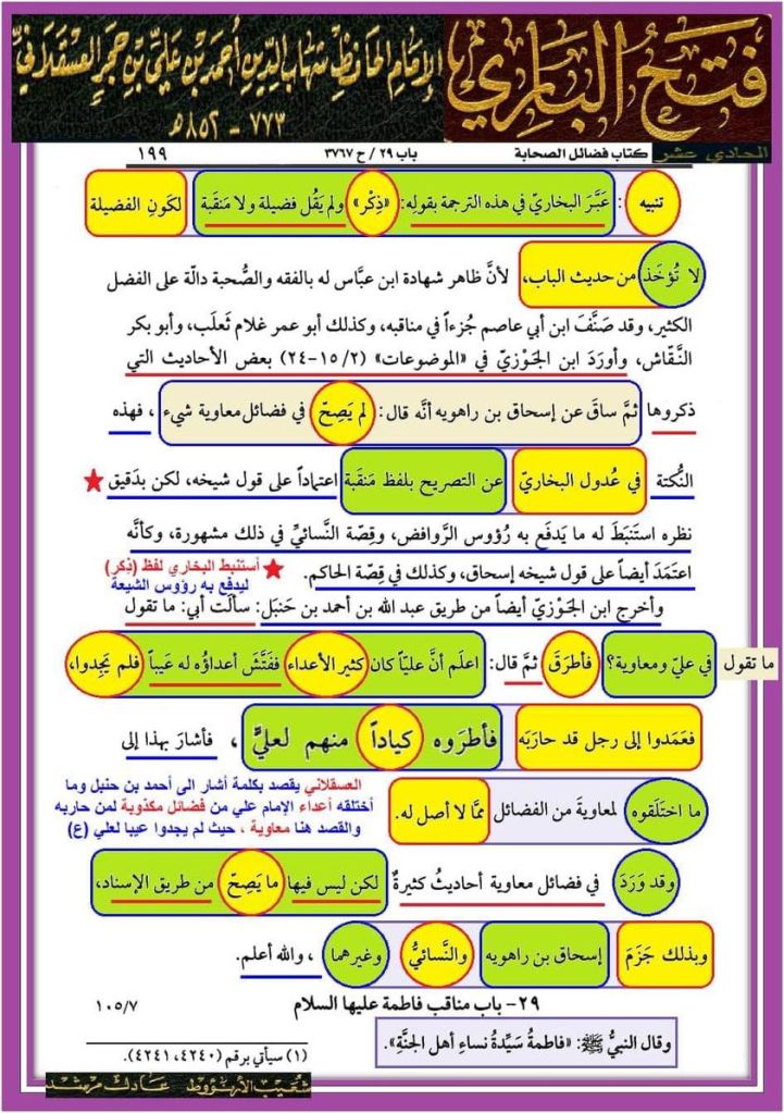 “اس باب میں امام بخاری نے لفظ “فضیلہ ” یا منقبتہ کی بجائے لفظ ذکر اس لئے لکھا ہے کہ اس باب کی حدیث سے فضیلت ثابت نہیں ہوتی ، البتہ ابن عباس رض کے قول حضرت معاویہ صحابی اور فقیہ تھے سے ان کی فضیلت پر دلالت پڑتی ہے ، اور ابن ابی عاصم نے اور اسی طرح غلام ثعلب ابو عمر اور ابوبکر النقاش نے ان کے مناقب میں ایک رسالہ تصنیف کیا تھا ، لیکن علامہ ابن جوزی نے ان کی بیان کردہ احادیث کو اپنی کتاب الموضوعات میں درج کرنے کے بعد لکھا ہے کہ امام اسحاق بن راھویہ رح نے فرمایا : حضرت معاویہ کی فضیلت میں کوئی صحیح حدیث ثابت نہیں ہے ۔ پس اسی نقطہ کے پیش نظر امام بخاری نے اپنے شیخ کی تحقیق پر اعتماد کیا اور صراحتہ لفظ منقبہ سے صرف نظر فرمایا لیکن باریک بنی سے اس باب کی حدیث سے روافض کی تردید بھی کر گئے ۔