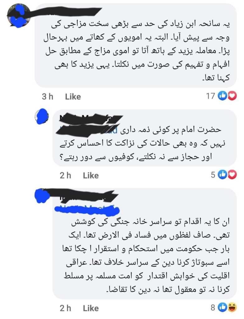 محرم کے مہینے میں ایک خاص قسم کا غامدیت اور دیوبندیتِ جدیدہ کا گٹھ جوڑ وجود میں آتا ہے. سکرین شاٹ یہ صاحب دیدہ دلیری کے ساتھ حضرت حسین رضی اللہ عنہ کے اقدام کو فساد فی الارض کہہ رہے ہیں، ہر سال نا معلوم اس طرح کی کتنی باتیں نظر سے گزرتی ہیں اور ایسی شخصیات کی پوسٹوں پر بھی جو یقیناً دیوبندیوں کے مطالعے میں بھی آتی ہیں، مگر مجال ہے کہ صحابہ کے نام نہاد علم برداروں کے کانوں پر جوں تک رینگے، کوئی ٹرینڈ چلے، صحابہ کے کچھ جیالے سامنے آئیں.